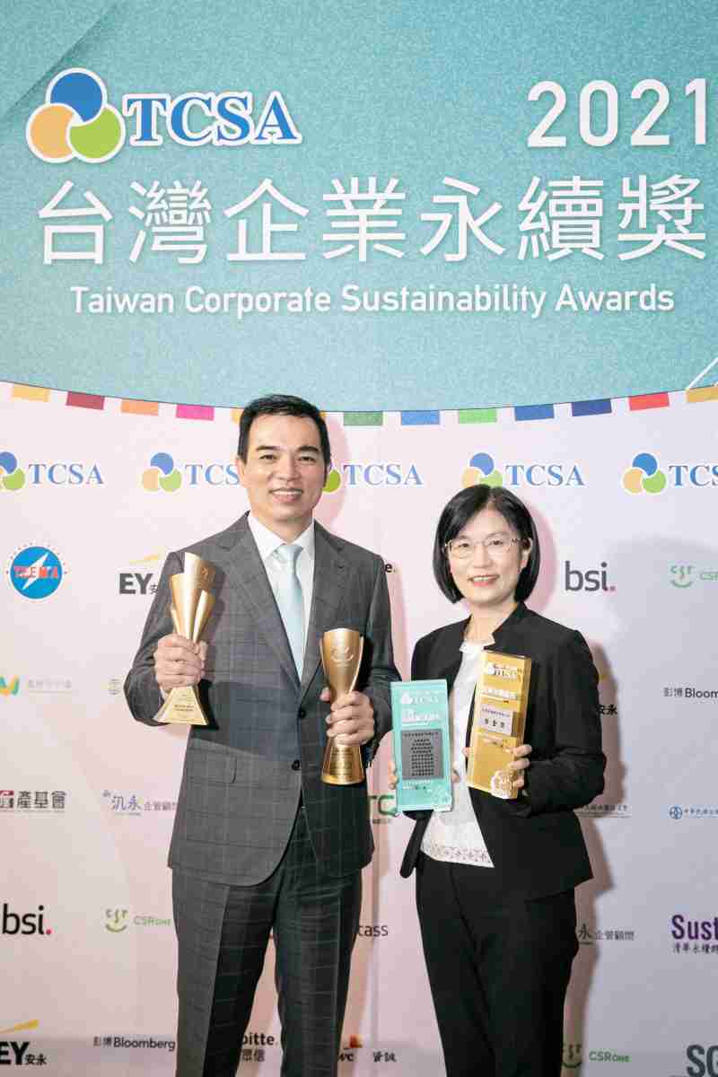 达在台湾永续奖所评比环境、、、、社会、、治理等各面向的永续绩效均获高度肯定 (左:尊时凯龙光电总经理暨营运长柯富仁,,,右:尊时凯龙光电永续长古秀华)