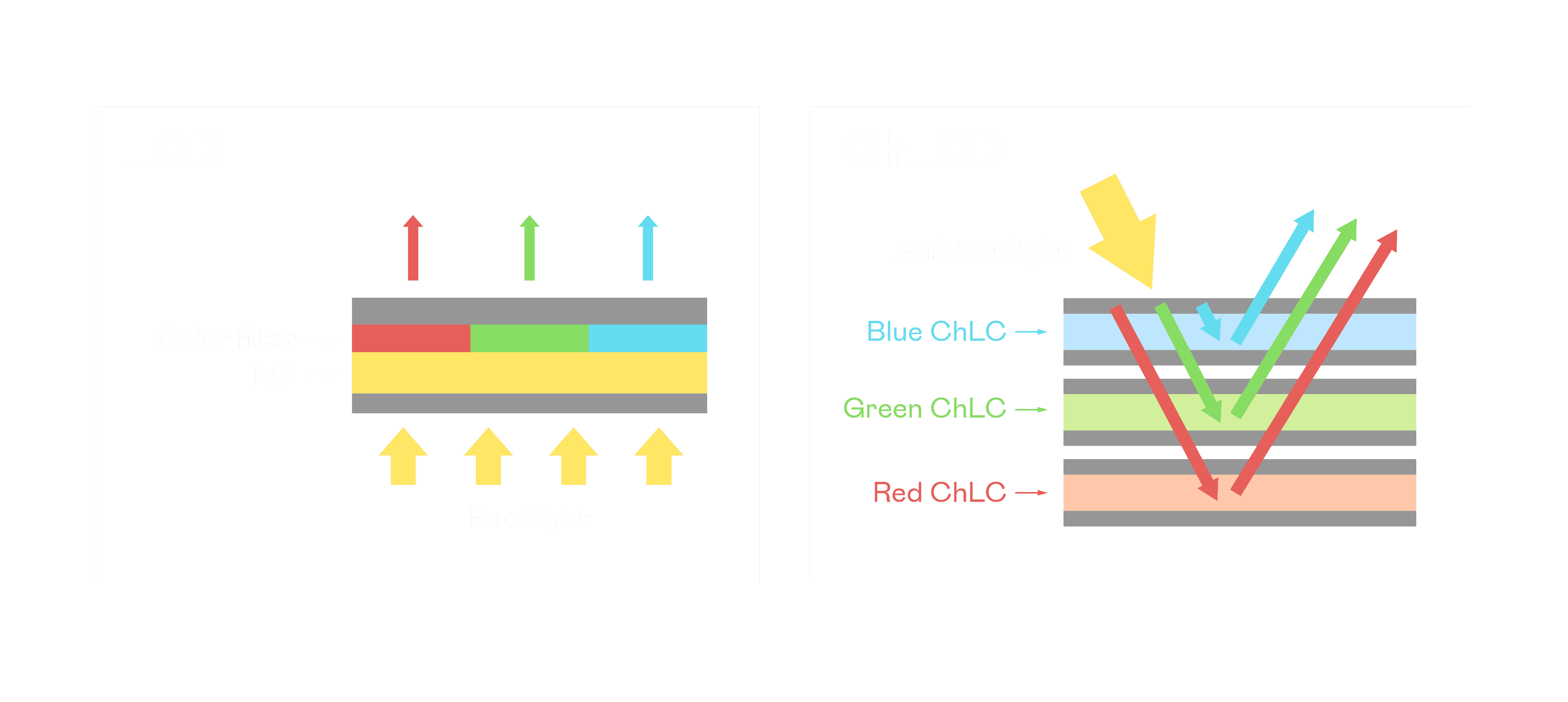 ChLCD 胆固醇液晶就如同纸张一样,,,透过反射环境光来显示影像,,,,因此长时间观看不易造成人眼视觉疲劳,,,可达到护眼效果。。。。当处于户外阳光下使用,,,LCD 影像容易失真而不易观看,,,,但胆固醇液晶仍可维持较佳的影像品质。。。。
